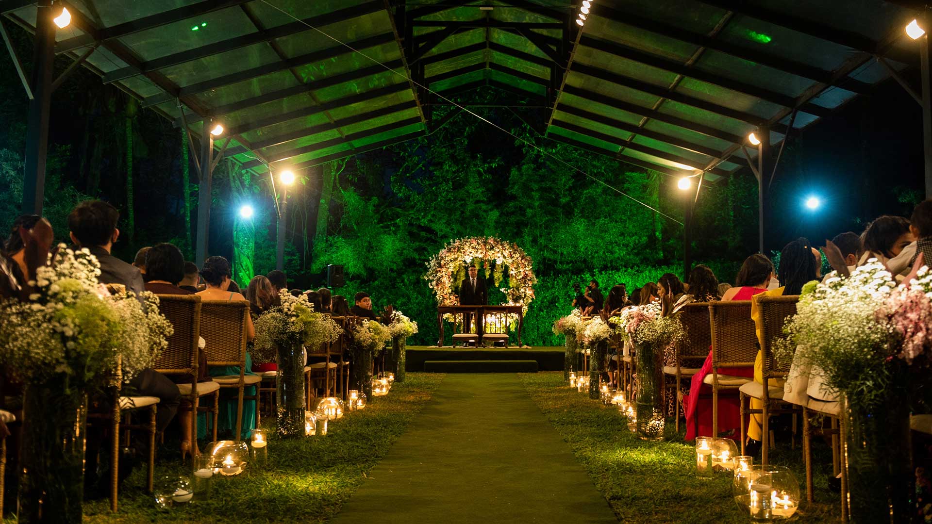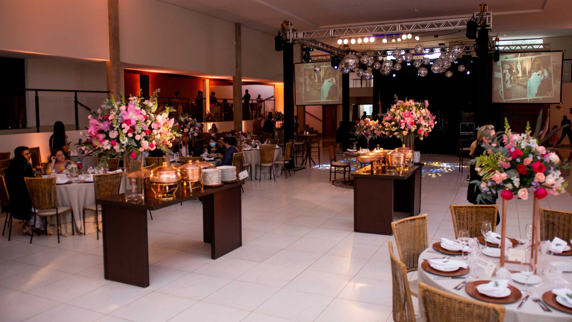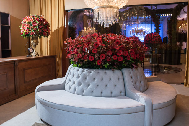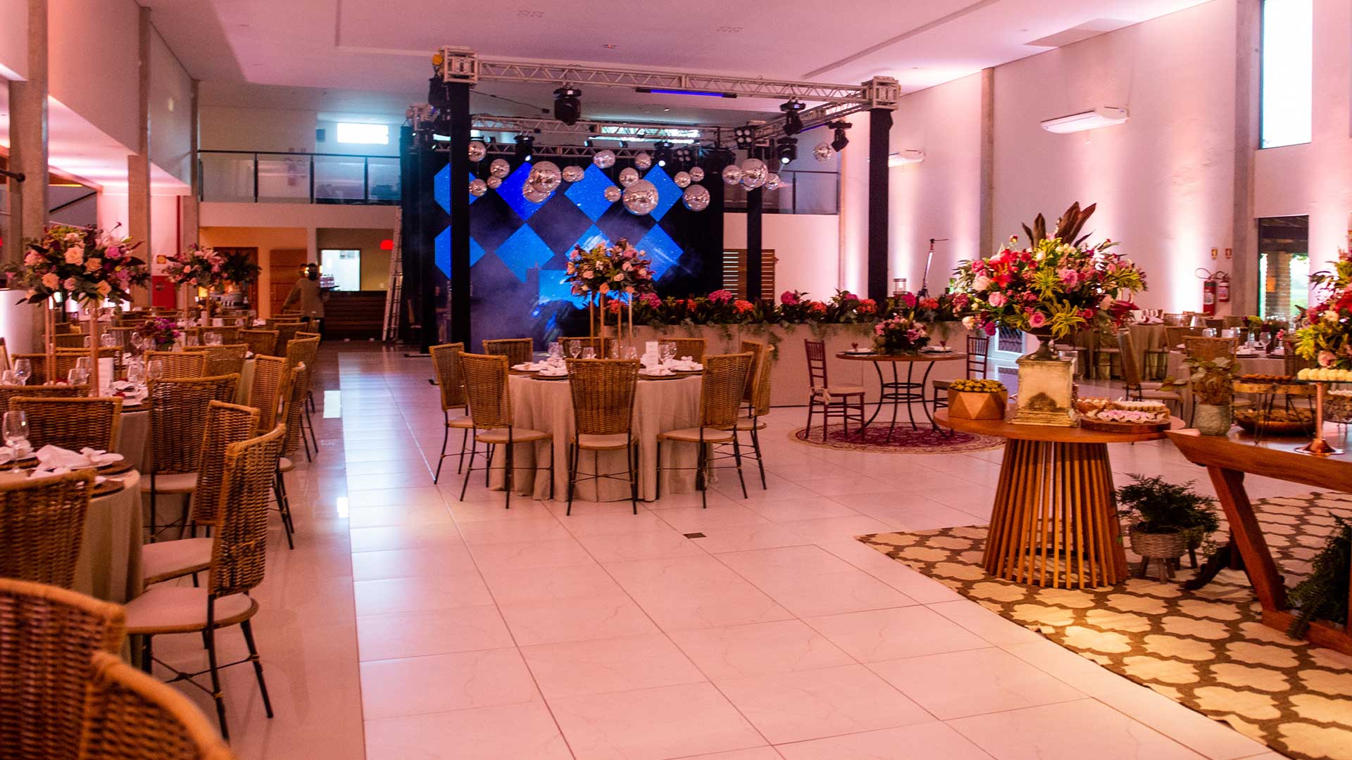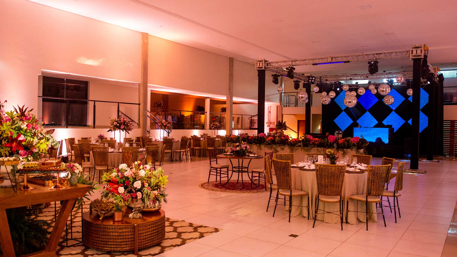Contamos com amplo salão avarandado e climatizado com dois mezaninos integrados, perfazendo uma área livre de 650 m2, e mais uma completa estrutura de cozinha, bar, fraldário, sala de noivas e um jardim com fontes e cascatas, envolvendo todo o conjunto.